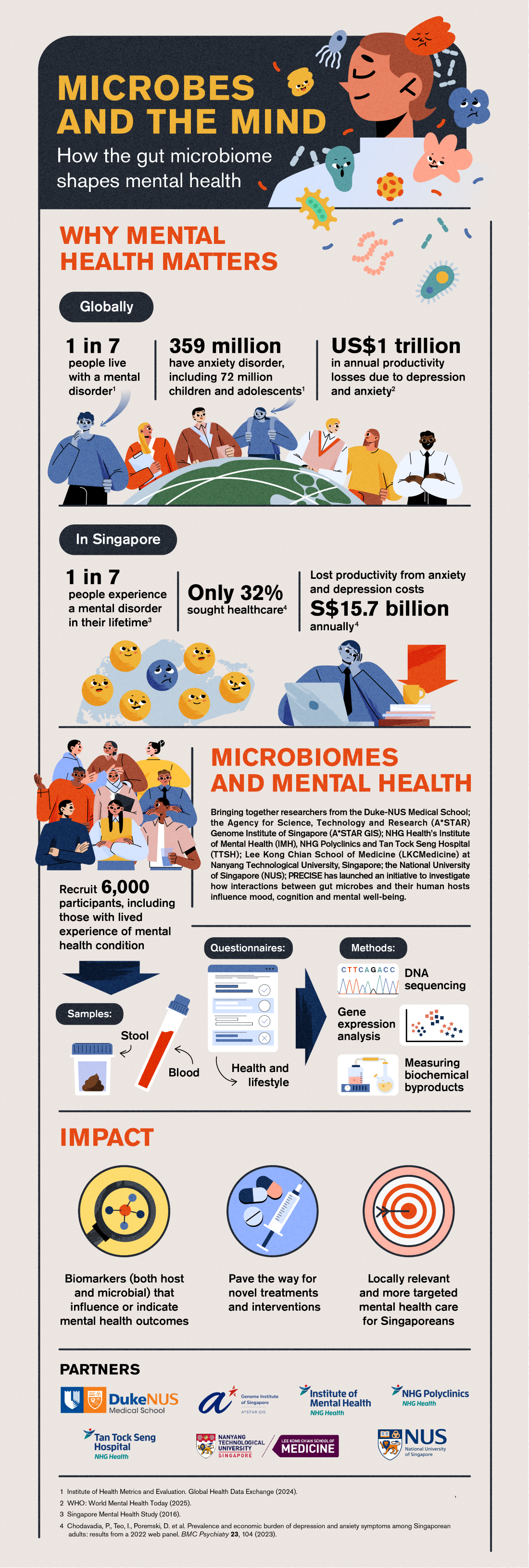 Building on the National Precision Medicine (NPM) programme's PRECISE-SG100K cohort, the study will recruit over 6,000 participants, including individuals living with mental health conditions. Researchers will collect biological samples (stool, skin, blood) and conduct psychological assessments to gather data on participant mental health status, use multi-omics technologies to identify characteristics of the microbial communities inhabiting in participants, making this one of the largest Asian mental health-microbiome cohorts.