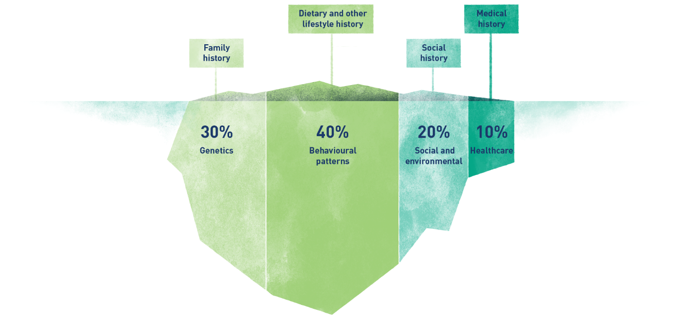 In fact, only 10% of health outcomes are determined by healthcare. One third is determined by genetics, while the rest is affected by social or environmental factors and behavioural patterns which are poorly captured during routine medical consultations.